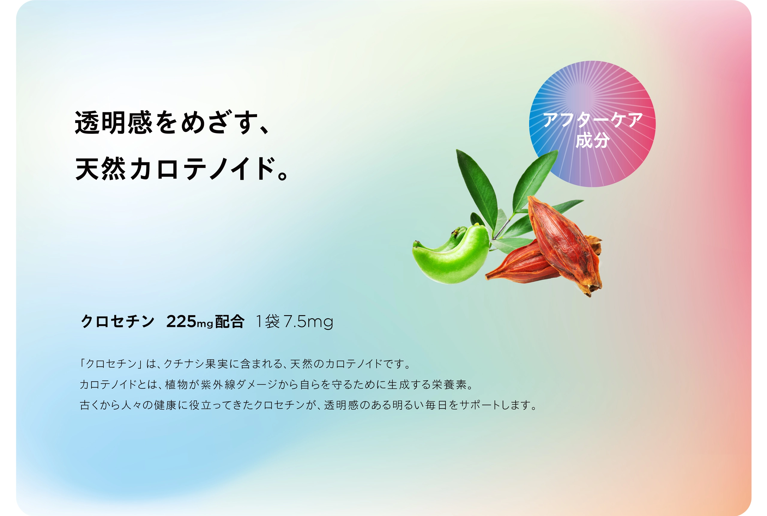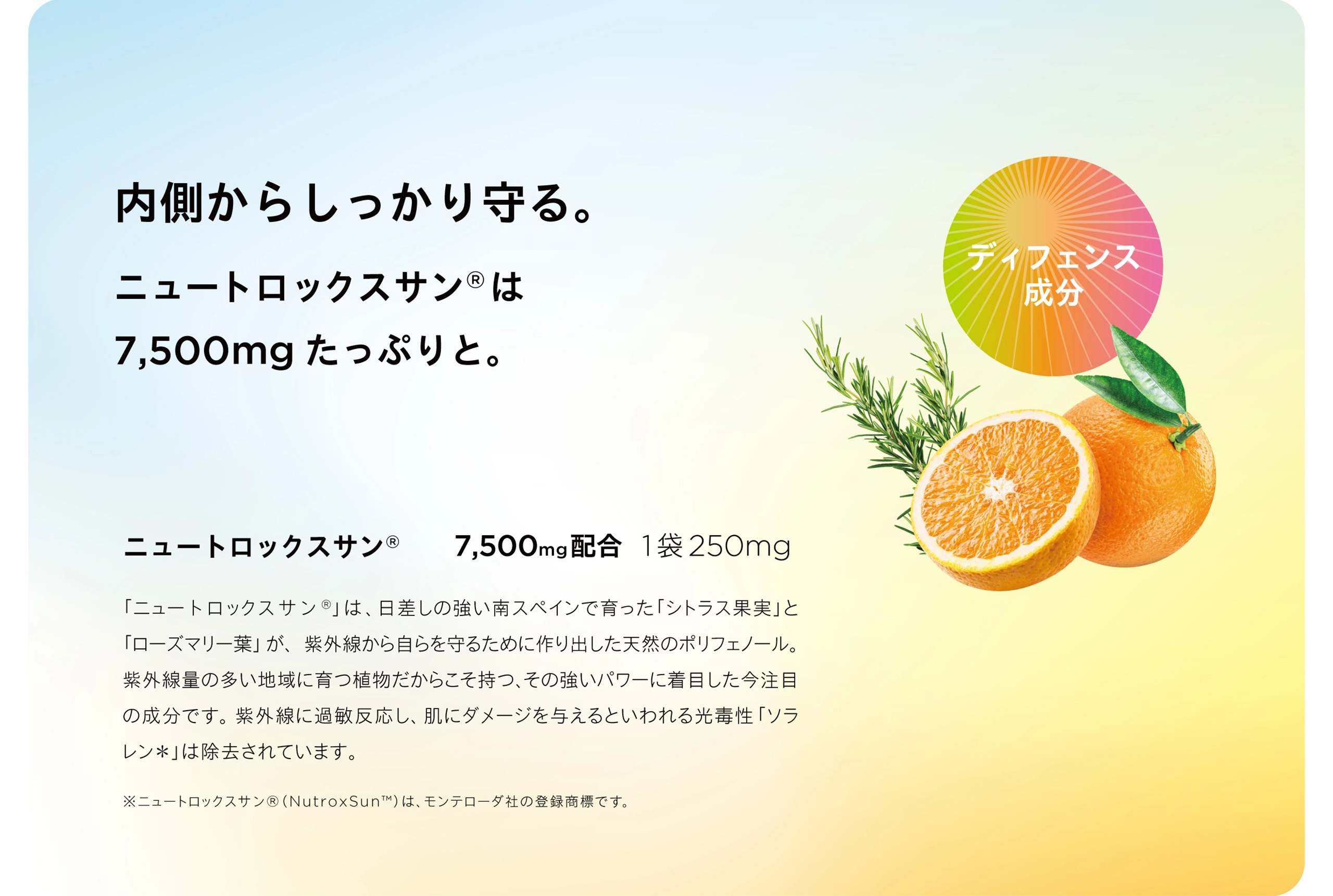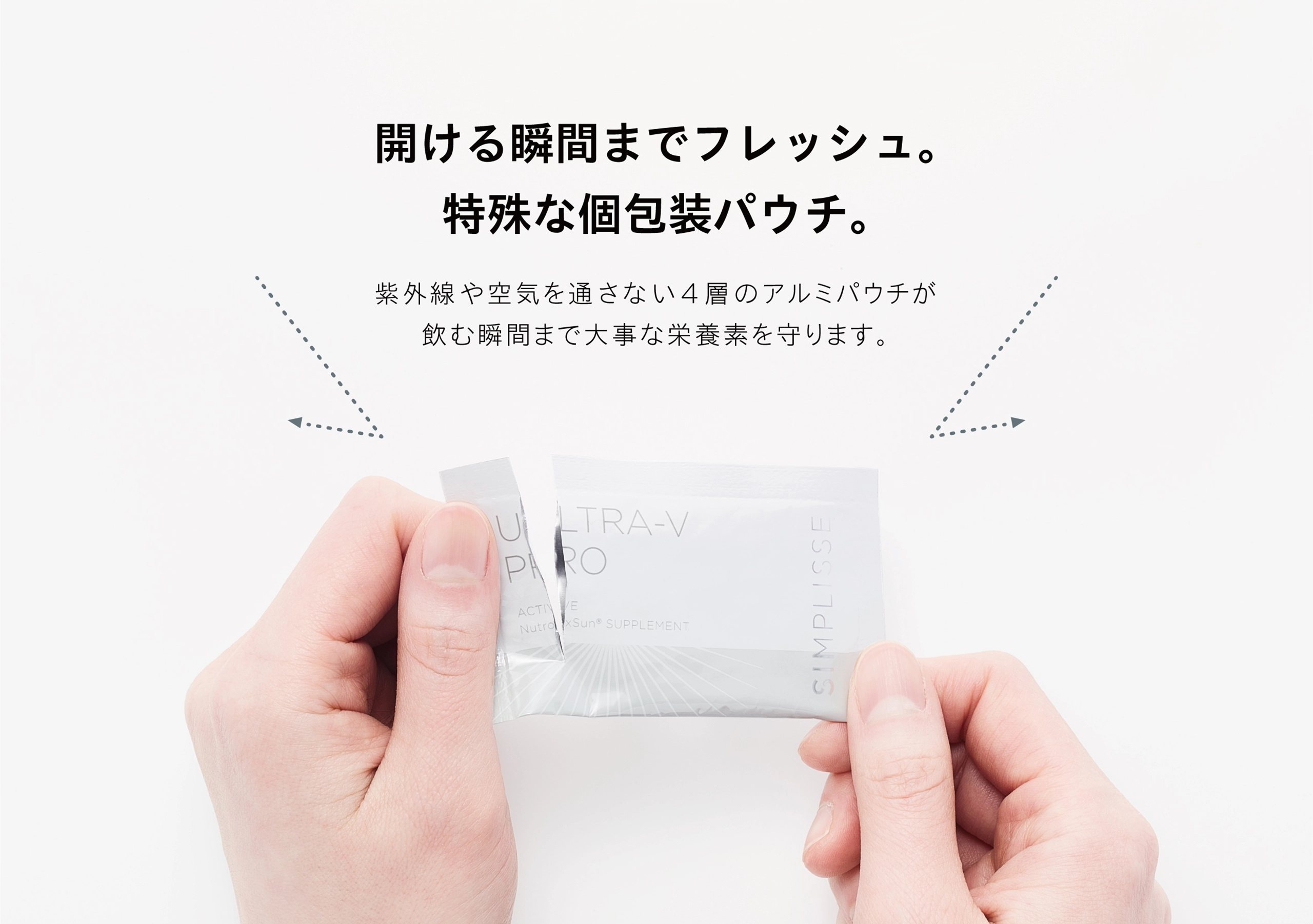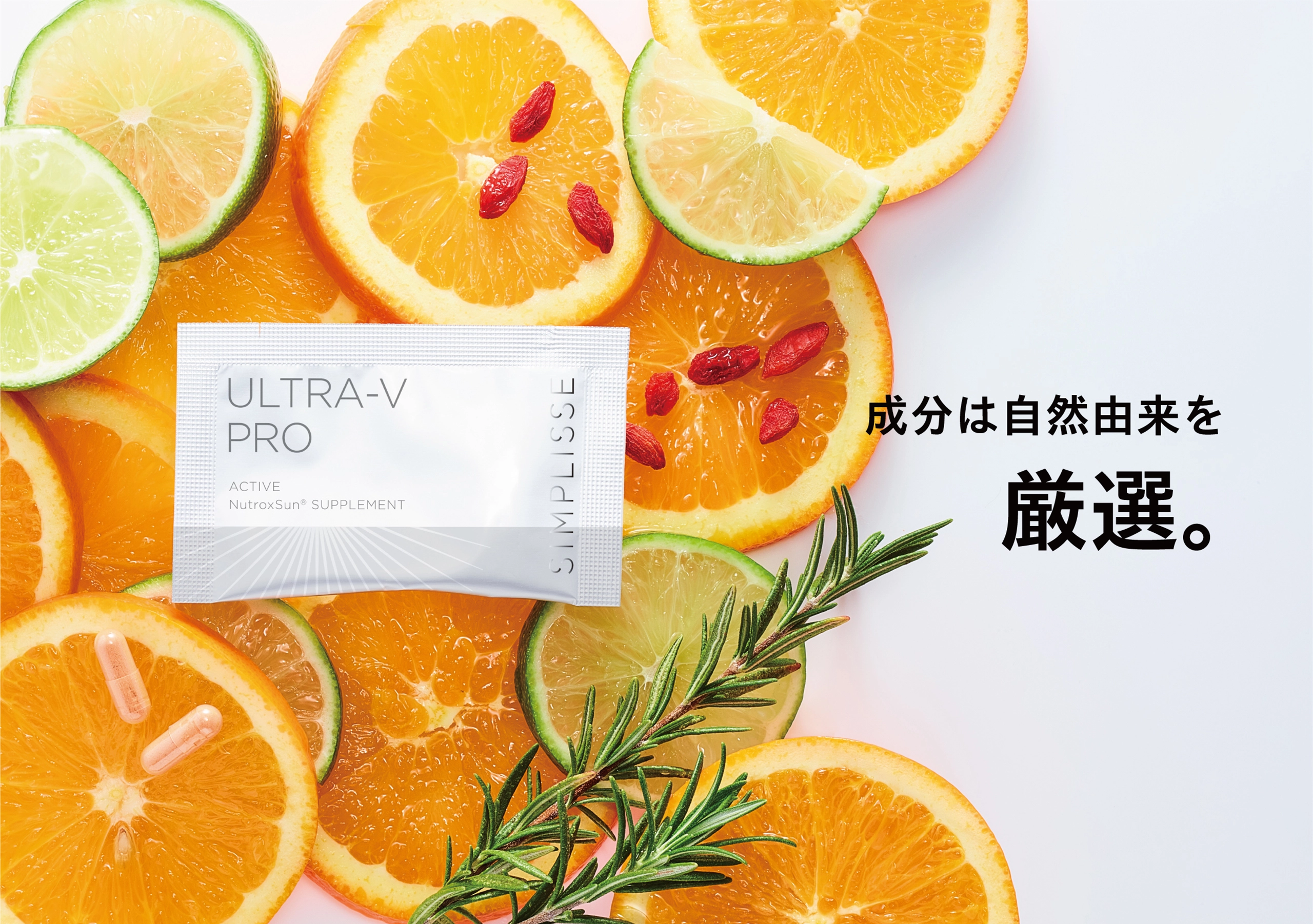 HOME ULTRA-V PRO くすんだトーンが気になっていたのに、 飲み始めて半年、鏡を見るのが楽しみになりました。 ファンデーションも1トーン明るいものに変えました! 今年の夏はいつものように悩まず過ごせそうです。 これからも飲み続けたいと思います! 子どもとの外出中、日焼け止めの塗り直しができなくて 今は仕方ないか…と思っていた時に出会ったサプリ! 飲むだけならできる!と即購入しました。 2粒の手軽さ、品質の安全性も含め、お気に入りです。 年々、自力で回復することの難しさを感じて、 始めたサプリメントが、とても合っていたみたいです。 体は食べたもので作られるって本当だなと実感しています。 天然のレチノールが入っているのも決め手でした。 つやっとみずみずしくいたいから、続けます! Q.日差しの強い日や外出する日に飲むのが良いですか。 A.曇りや雨の日も、雲や窓ガラスを通り抜けて日差しが届いていますので、毎日継続してお飲みいただくことをおすすめいたします。 また、若々しい透明感は日々の栄養からつくられますので、季節や天候にかかわらず一年中の対策としてお役立てください。 Q.いつ飲むのが良いですか。 A. 1日1袋(2粒)を目安に、水又はぬるま湯などと一緒にお召し上がりください。 毎日お飲み忘れなく続けていただくために、毎朝など決まった時間にお飲みになることをおすすめいたします。 Q.年齢制限はありますか。子どもでも飲めますか。 A. 年齢や性別に制限はございません。カプセルの形状となりますので喉に詰まる恐れがある年齢のお子さまにはおすすめしておりません。 Q.一日何粒まで飲んで良いですか。 A. 一日1袋(2粒)が目安になりますが、ご体調や生活リズムに合わせてお飲みください。ご実感いただくために、一度に多くお飲みいただくよりも、毎日欠かさずご飲用いただくことをおすすめいたします。 Q.病院の薬を飲んでいますが併用は大丈夫ですか。 A. 通院中の方および糖尿病の方は、かかりつけの医師、薬剤師にご相談の上お召し上がりください。 Q.妊娠中や授乳中でも飲めますか。 A. 妊娠中は控えた方がよいとされているローズマリーエキスを配合しておりますので、本品の摂取をお控えください。 授乳中の方は特段問題ございませんが、ご体調もデリケートな時期ですので、かかりつけの医師または薬剤師にご相談の上お召し上がりください。 Q.他のサプリメントと併用しても良いですか。 A. SIMPLISSEのサプリメントとの併用は問題ありません。また、本品は食品ですので他社のサプリメントとの併用も基本的には問題ありませんが、同じ成分を過剰に摂取すると体の負担となる場合がありますので、成分をご確認の上お召し上がりください。 Q.商品は安全ですか。 A. 国内のGMP認証取得工場※で高品質の原材料、高い安全性にこだわって製造しています。また、着色料・香料・保存料・甘味料など一切無添加です。 ※GMPとは…Good Manufaturing Practiceの略称。品質の良い優れた製品を製造するために、原材料の受入ー製造ー試験ー出荷にいたるまでの遵守事項を定めたもの。 HOME ULTRA-V PRO